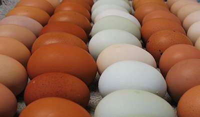 Eggs from our truly free range chickens are provided in a colorful array and sold by the dozen.